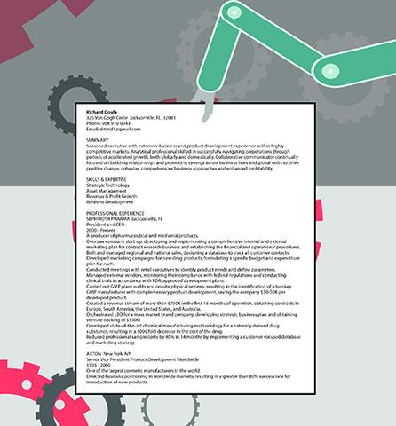 After applicant tracking system friendly version is complete, we layer it behind a version with the same content that is attractive to hiring managers. The computer can’t see the design elements and the humans can’t see the stripped-down version that gets you through the filters. We’ve created two versions in one.